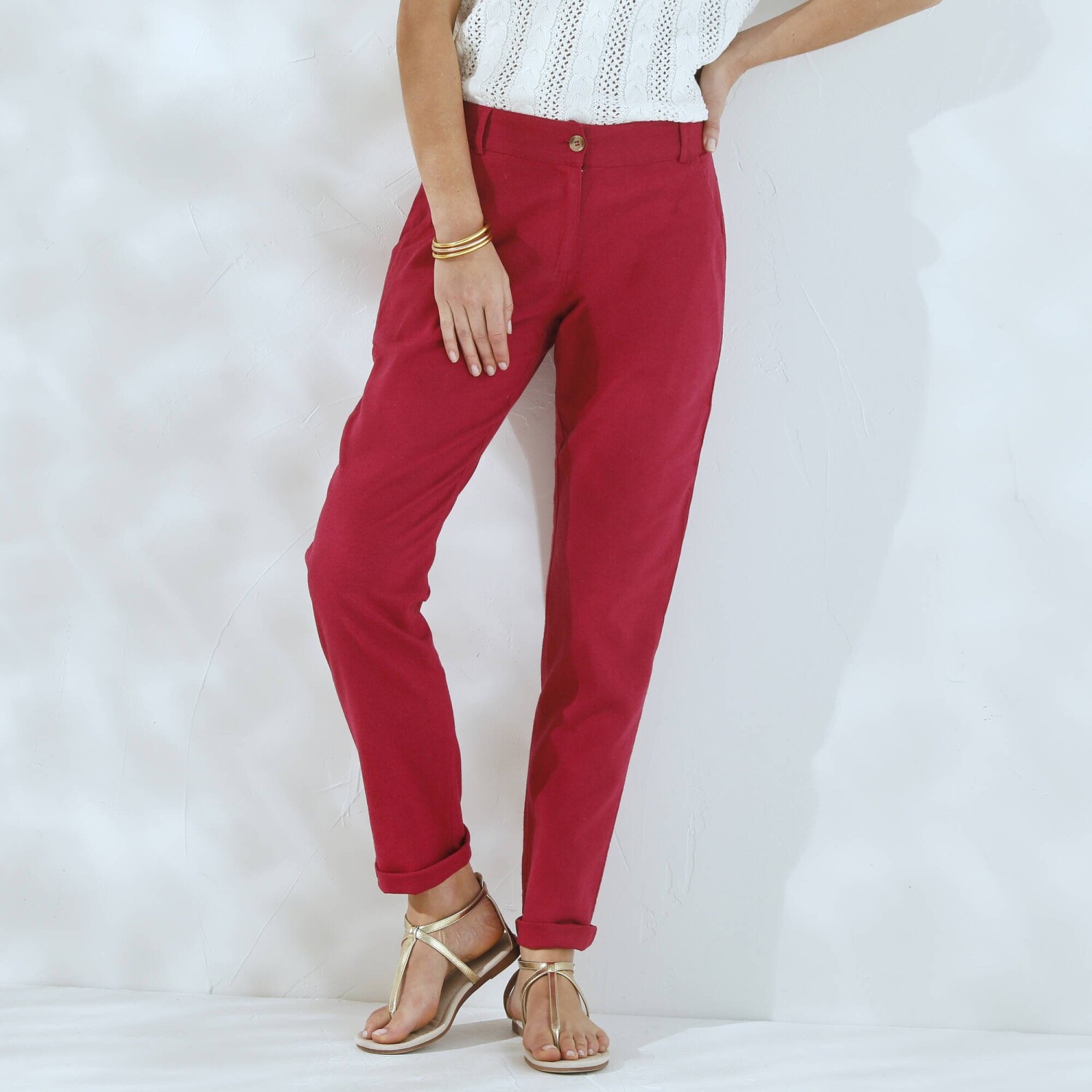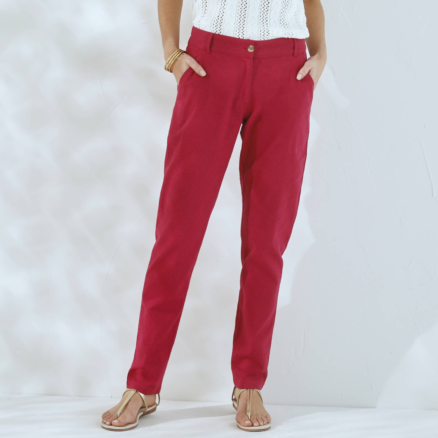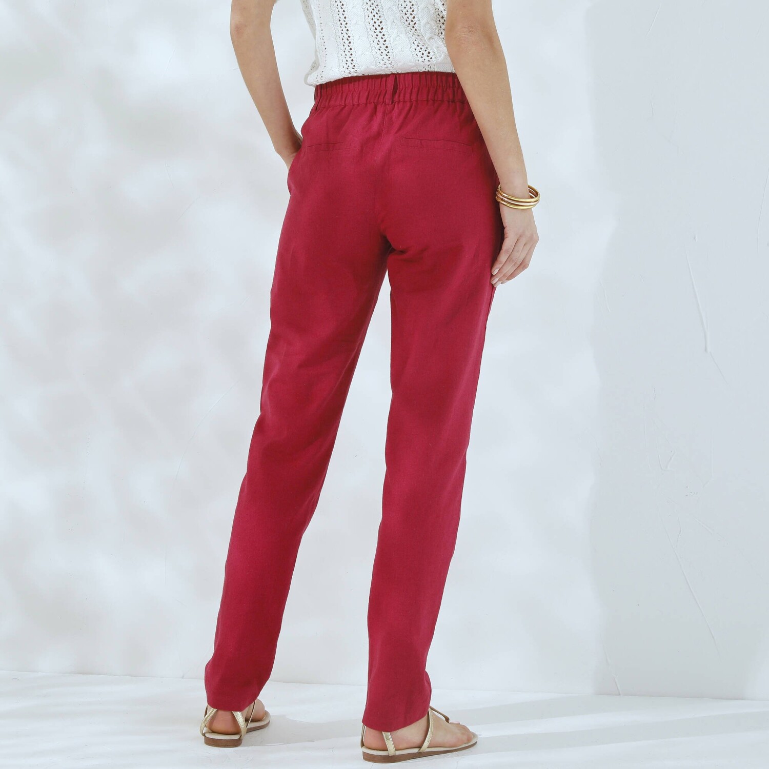 Jednoduchá údržba a príjemné nosenie, to sú hlavné prednosti nohavíc v obľúbenom strihu chino. Navyše zo sviežej zmesi bavlny a ľanu. Strih chino (netlačí na stehnách). Bežná výška pása. Tvarovaný pás s pútkami, vzadu pružný. Zapínanie na zips a gombík. 2 klinové vrecká. 2 falošné vrecká s paspulou vzadu. Možno prať na 30 °C.