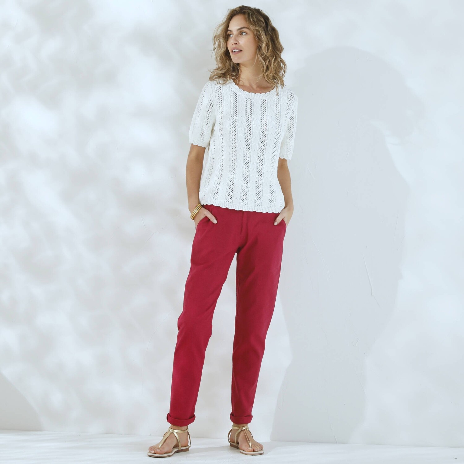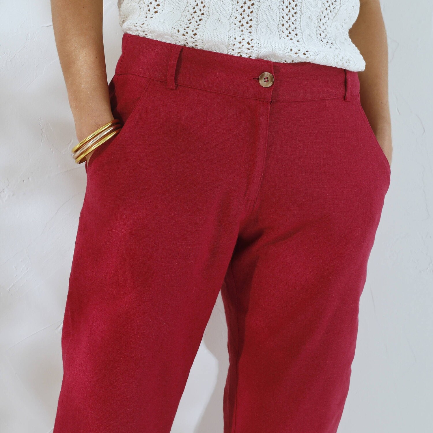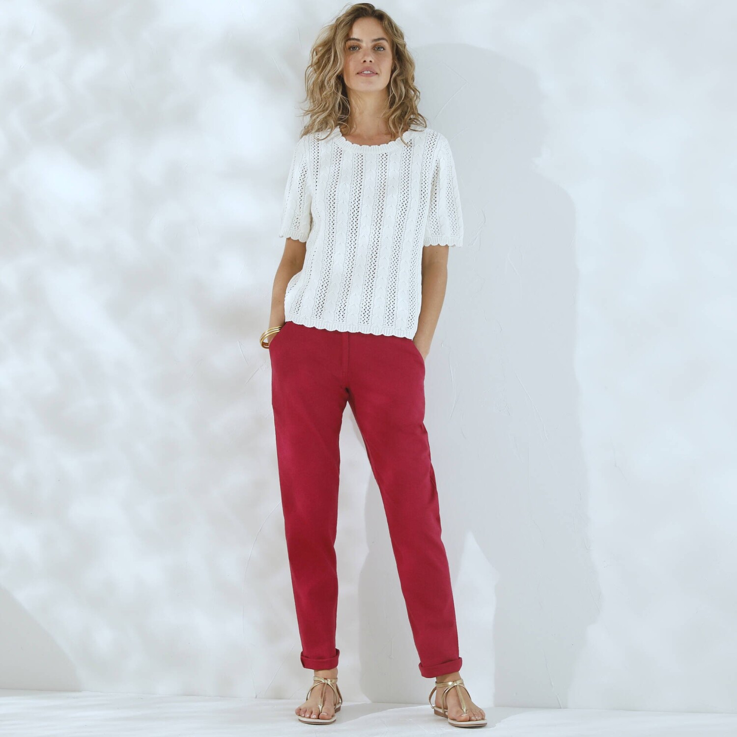 Jednoduchá údržba a príjemné nosenie, to sú hlavné prednosti nohavíc v obľúbenom strihu chino. Navyše zo sviežej zmesi bavlny a ľanu. Strih chino (netlačí na stehnách). Bežná výška pása. Tvarovaný pás s pútkami, vzadu pružný. Zapínanie na zips a gombík. 2 klinové vrecká. 2 falošné vrecká s paspulou vzadu. Možno prať na 30 °C.