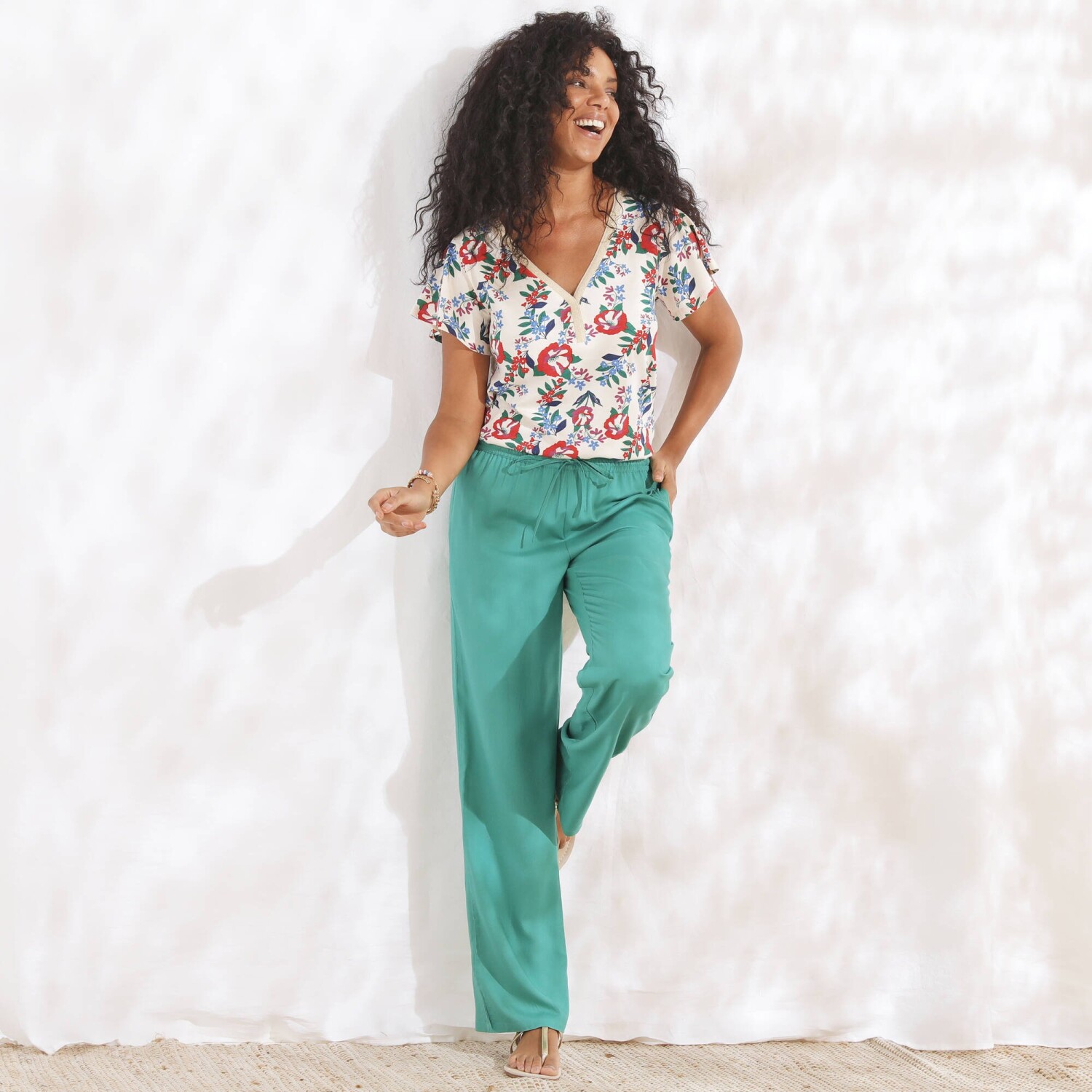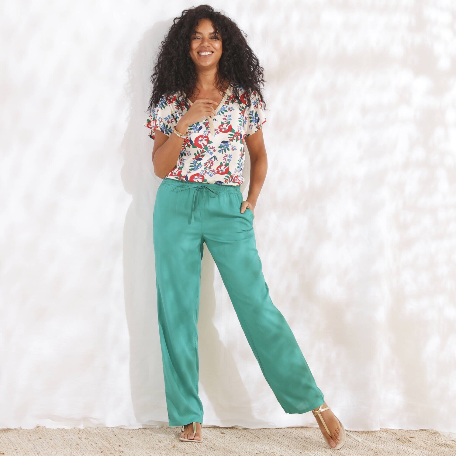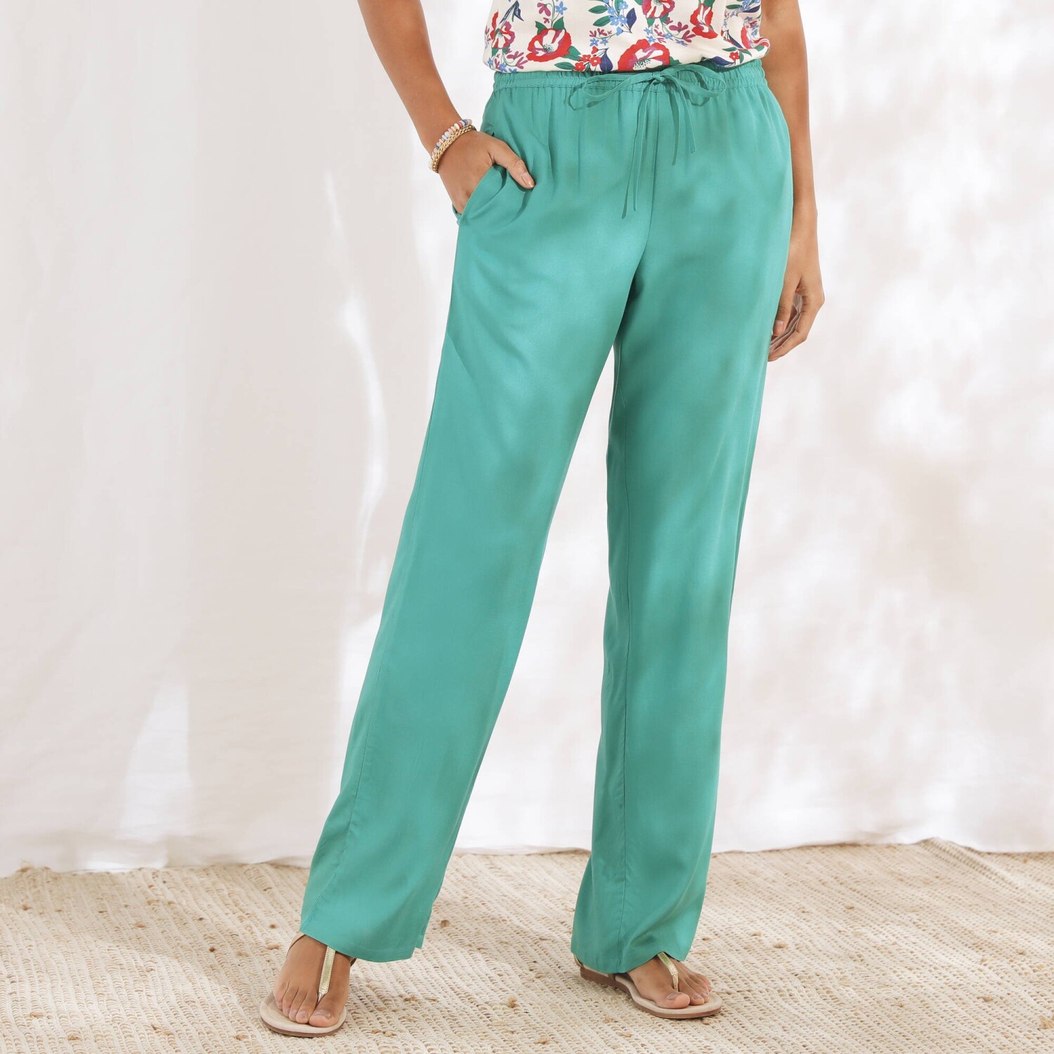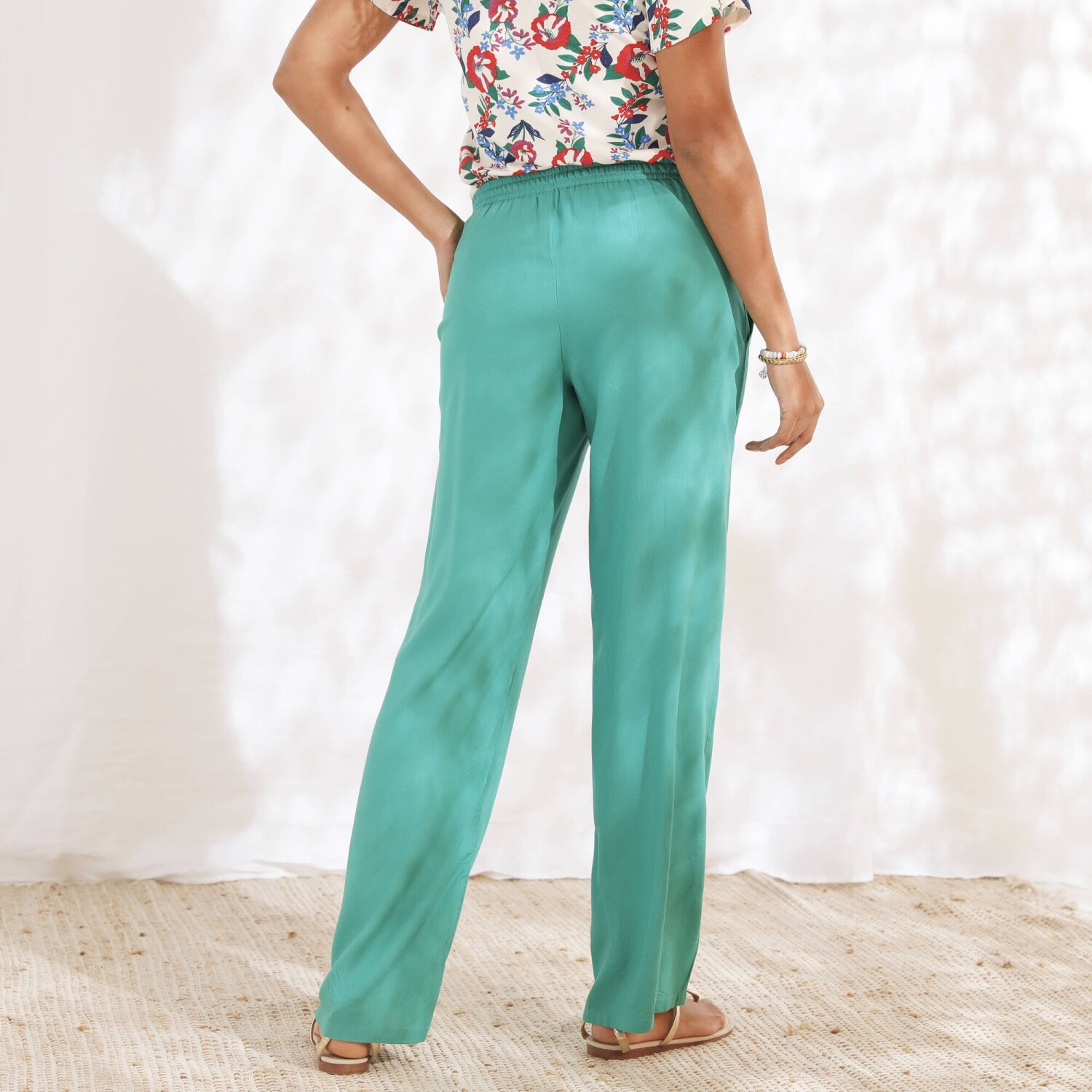 Túto sezónu by Vám nemali uniknúť módne jednofarebné nohavice so zlatistým opaskom. Vo vzdušnom chino strihu a 2 záševkami pod pásom, to všetko vytvára skvelé krivky siluety. Zo vzdušného materiálu sa príjemne nosia. Bežná výška pása. Chino strih. Vpredu plochý, vzadu pružný pás. 2 sklady + 2 klinové vrecká vpredu. Odnímateľný opasok na zaviazanie, s prímesou zlatistého vlákna. Možno nosiť s ohrnutými nohavicami. Možno prať v práčke.