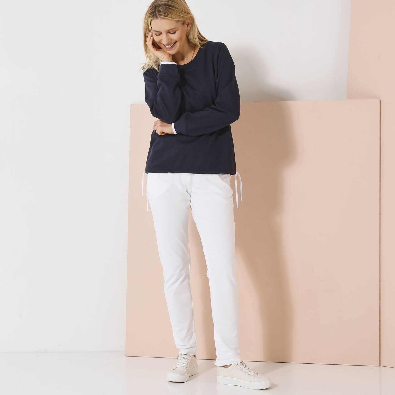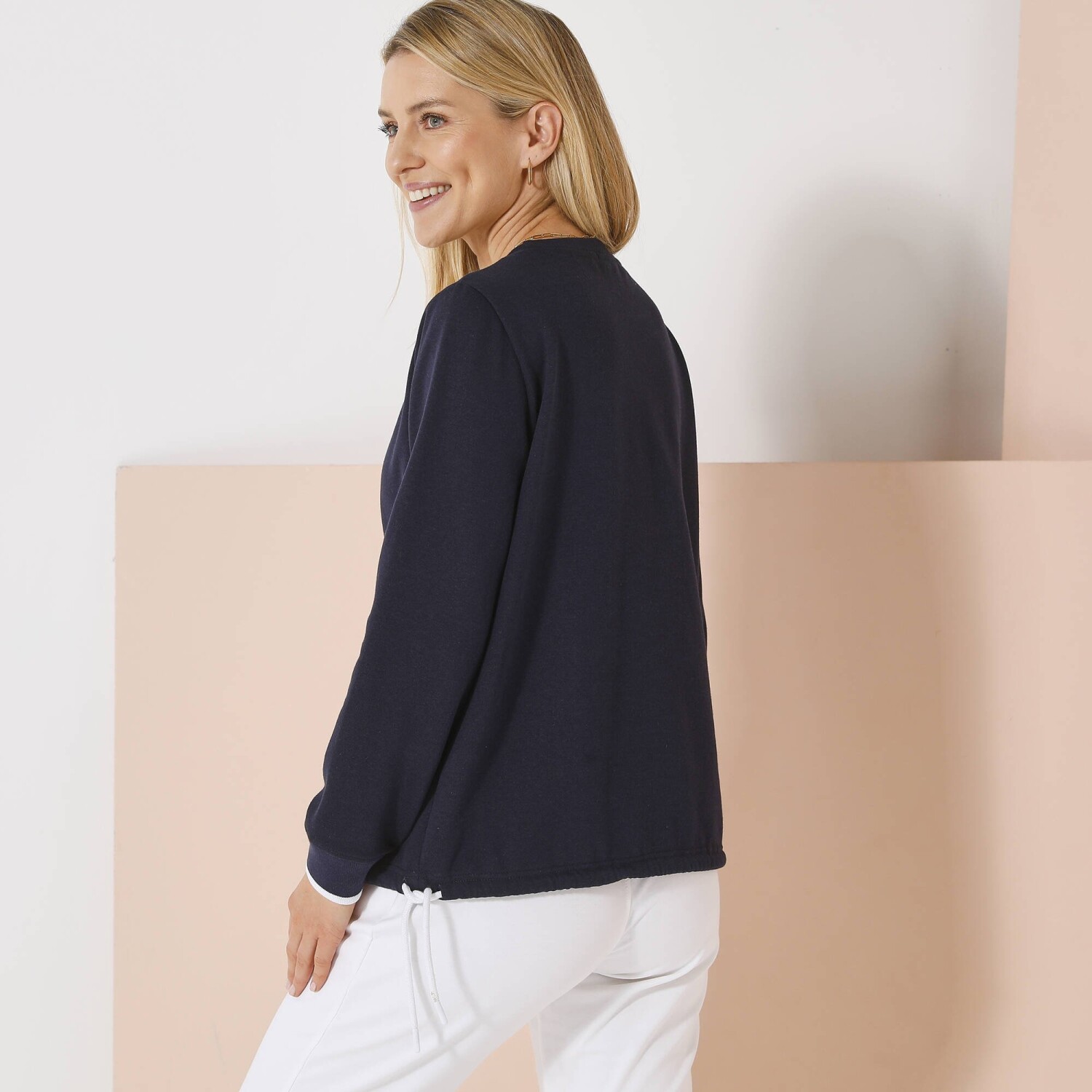 Moltonová bunda s prestrčenou šnúrkou sľubuje pohodlie na každý deň. Jemný česaný molton. Okrúhly vrúbkovaný výstrih. Dlhé rukávy s vrúbkovaním a kontrastnými pruhmi. Rovný spodný lem s prestrčenou šnúrkou na každej strane. Standard 100 by Oeko-Tex (n° CQ 1216/3 IFTH). Táto známka označuje textilné výrobky, ktoré boli podrobené laboratórnym testom na široké spektrum škodlivých látok a výrobok je bezpečný nad rámec platných noriem. Možno prať v práčke.