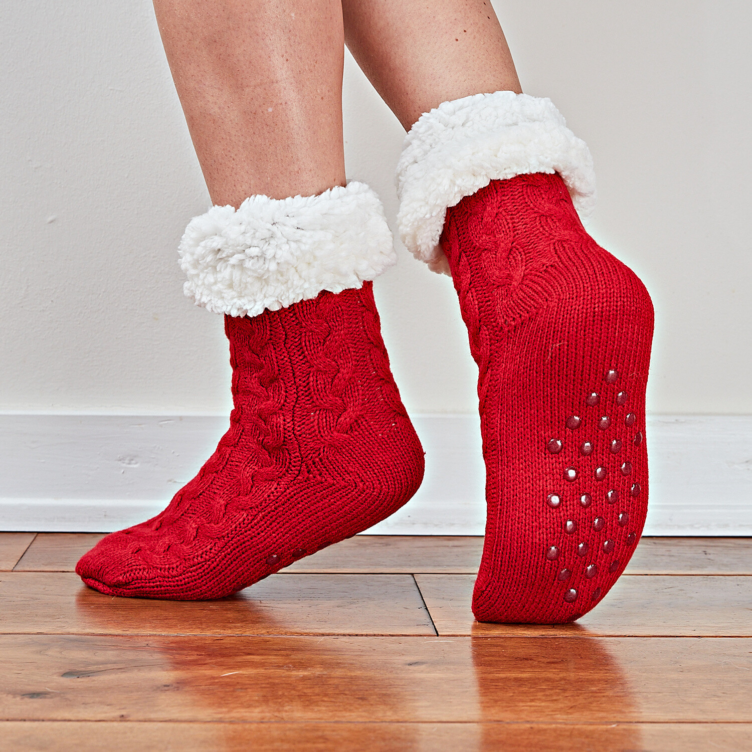 Elegantný úplet s vrkočovým vzorom a huňatým lemom na vonkajšej strane az mäkkého plyšu na vnútornej strane. Tieto útulné a hrejivé ponožky s protišmykovou podrážkou s nopkami budú konkurovať akýmkoľvek papučkám. Príjemne mäkké + hrejivé. Plne podšité plyšom. S protišmykovými výstupkami. Pre ženy + mužov.