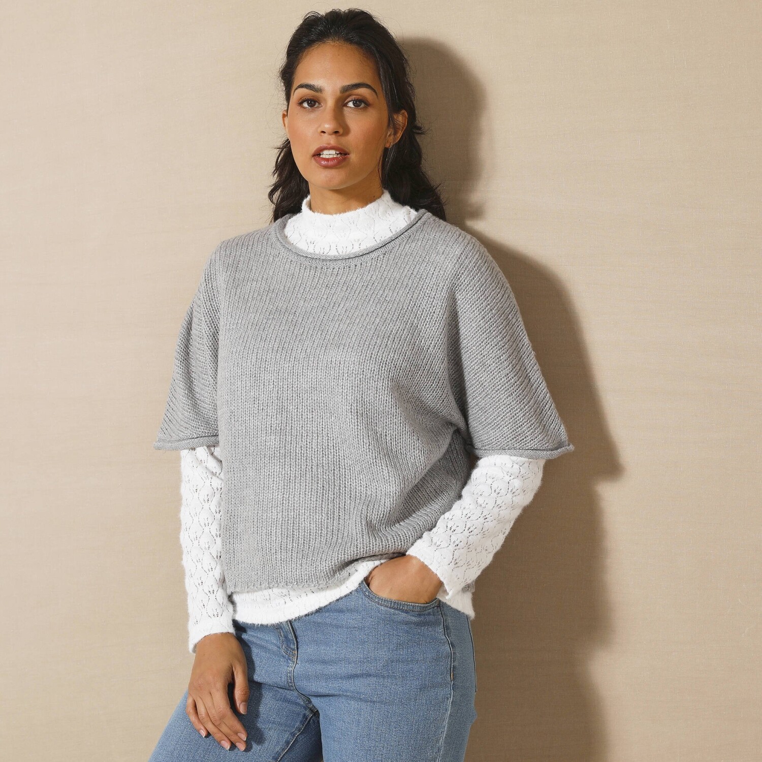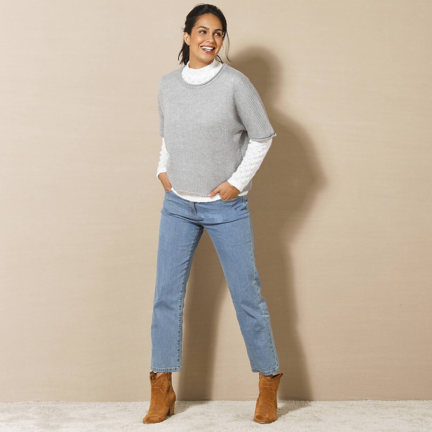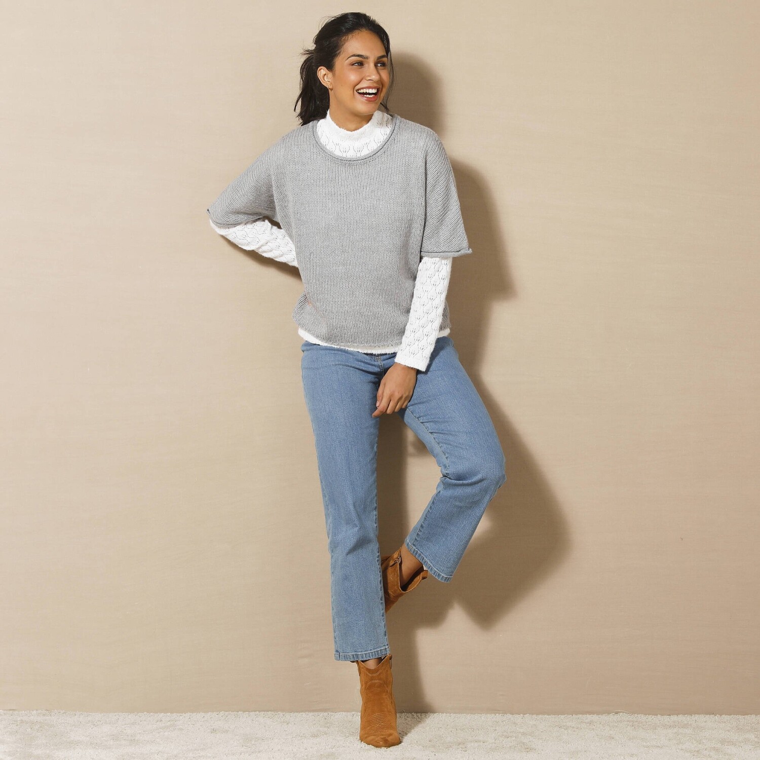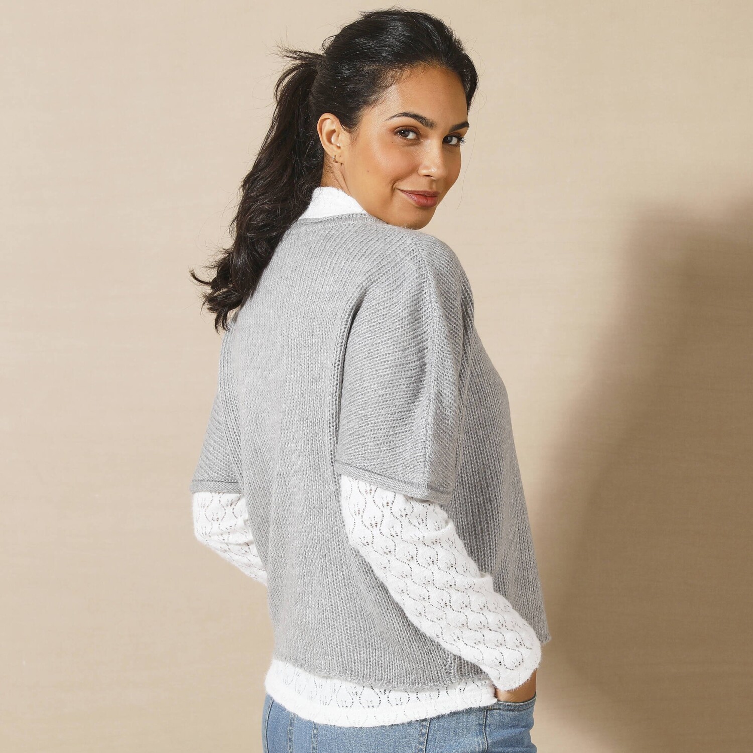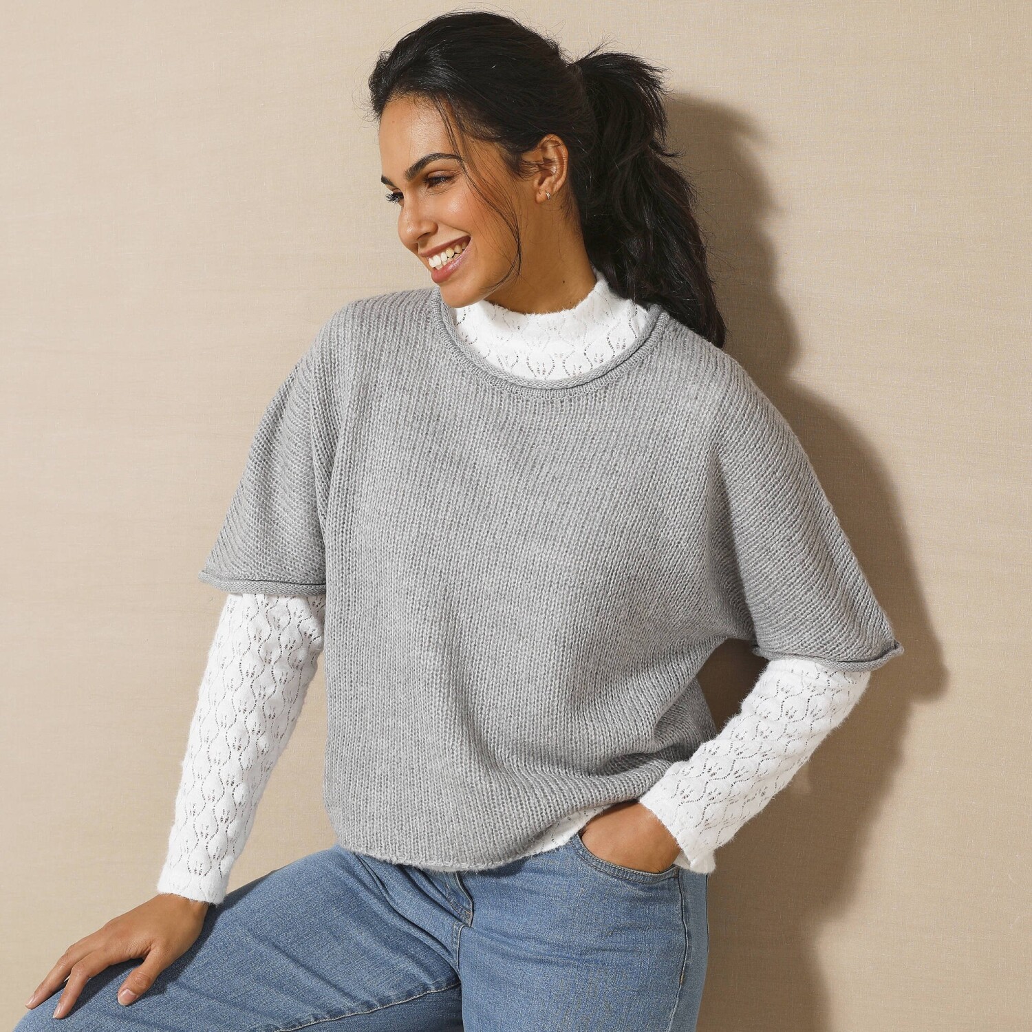 Skvelá šírka, nadýchaný úplet, absolútne pohodlie. Tento pončo pulóver sa rýchlo stane pevnou súčasťou šatníka. Módny strih z úpletu mohérovového na dotyk. Jednoduchá údržba, možno prať v práčke. Okrúhly voľný výstrih. Voľné ramená. Rukávy po lakte. Rovný spodný lem. Možno prať v práčke.