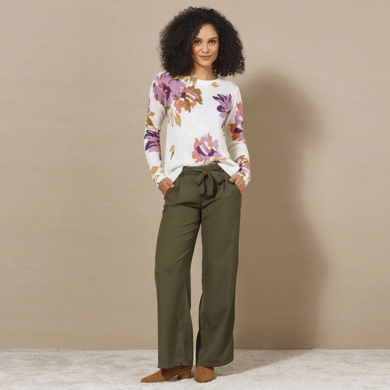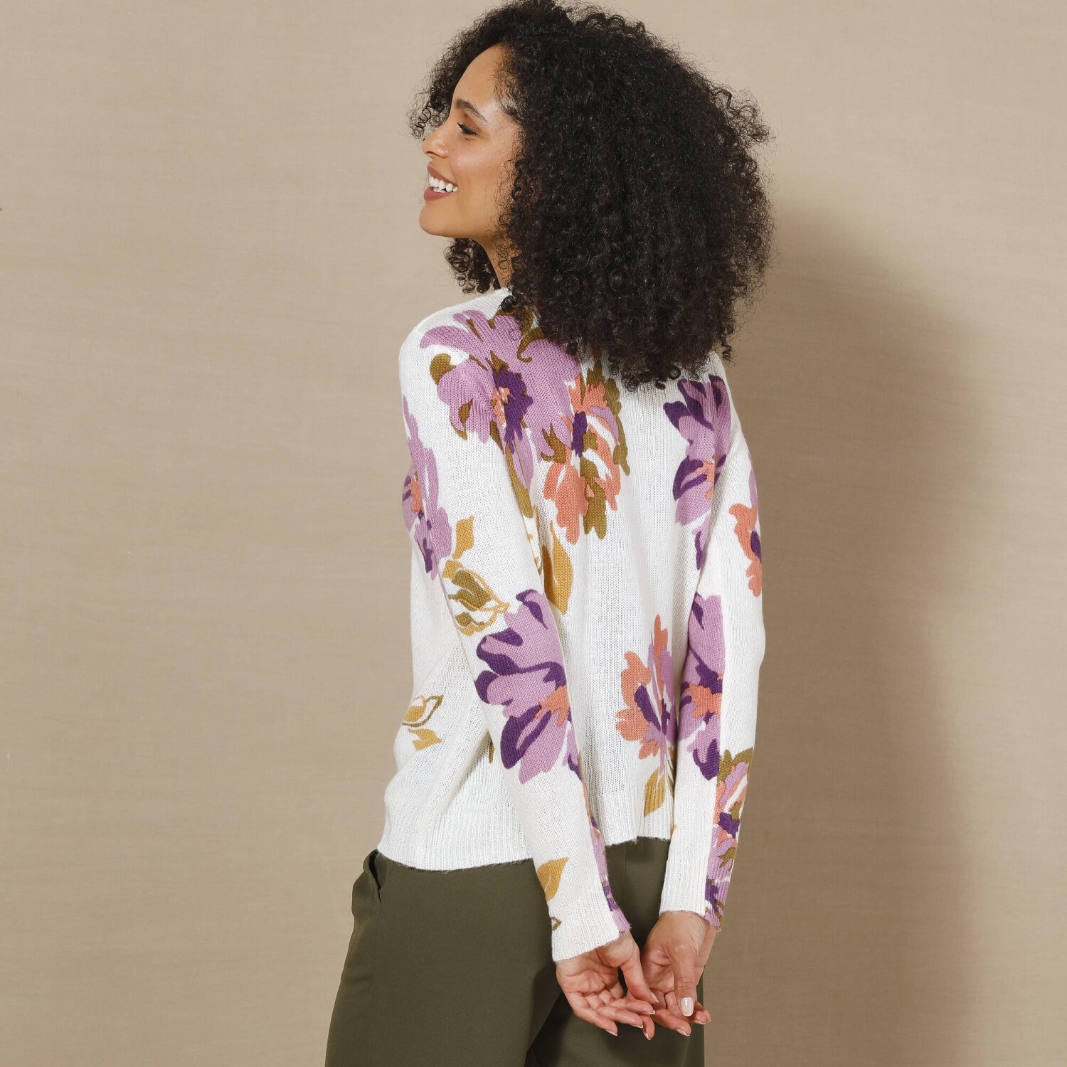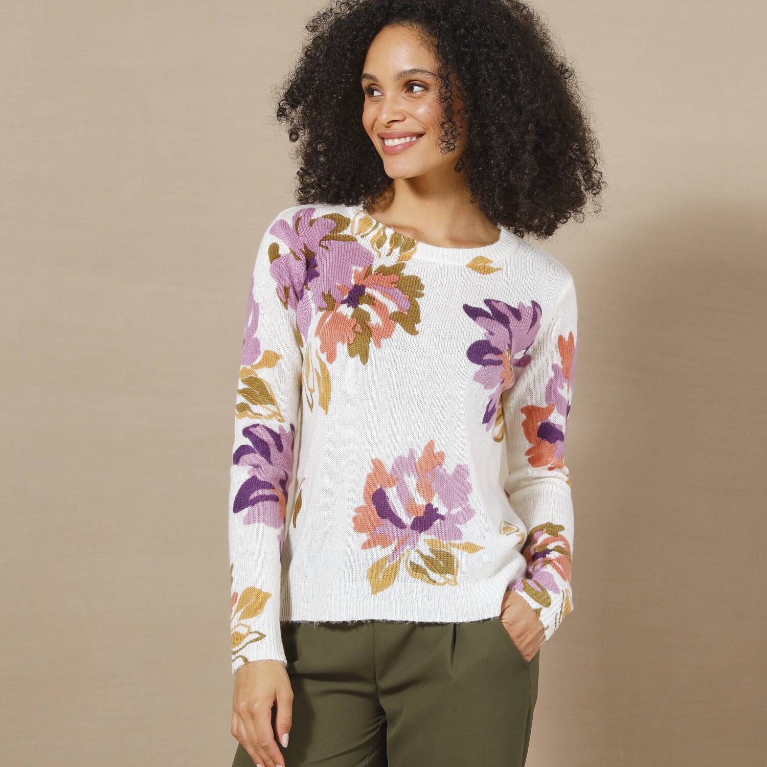 Kvety, farby a jemnosť - pulóver s potlačou rozžiari Váš model. Z úpletu mohérového na dotyk. Okrúhly výstrih. Vpredu a vzadu potlač veľkých kvetov. Dlhé rukávy. Rovný dolný lem. Vrúbkovaný výstrih, manžety a spodný lem. Možno prať v práčke.