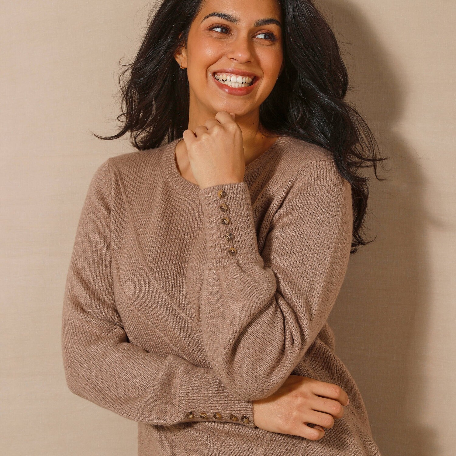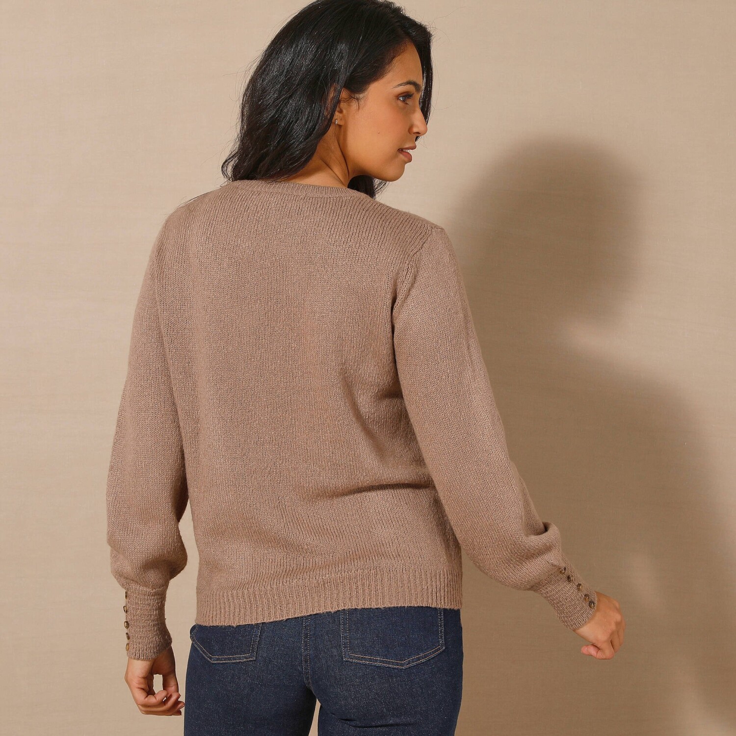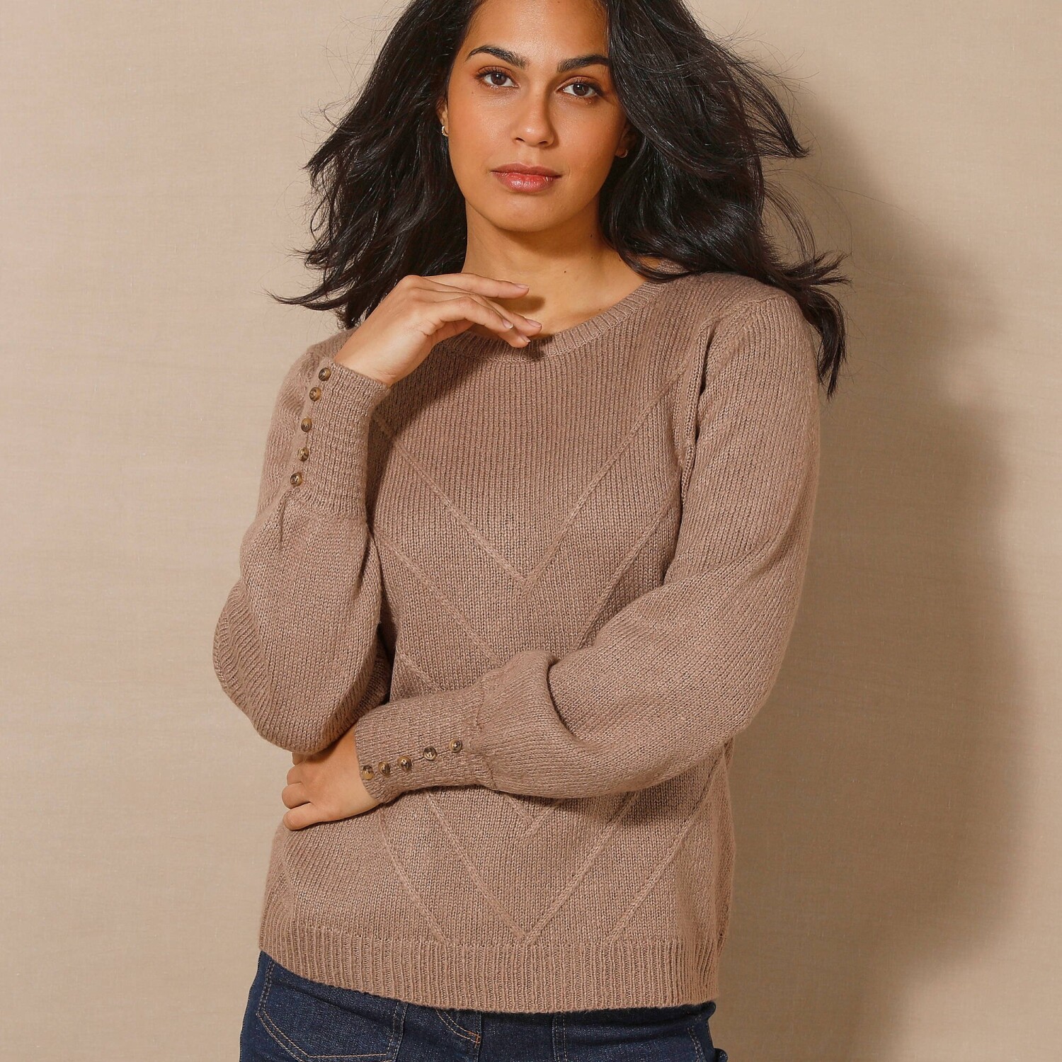 Na prednom diele pletený vzor do "V" a ozdobné gombíky na manžetách, tento pulóver je absolútne očarujúci. Okrúhly výstrih. Dlhé, mierne nadýchané rukávy zakončené vrúbkovaním a gombíkmi so vzhľadom rohoviny. Rovný spodný lem. Možno prať v práčke.
