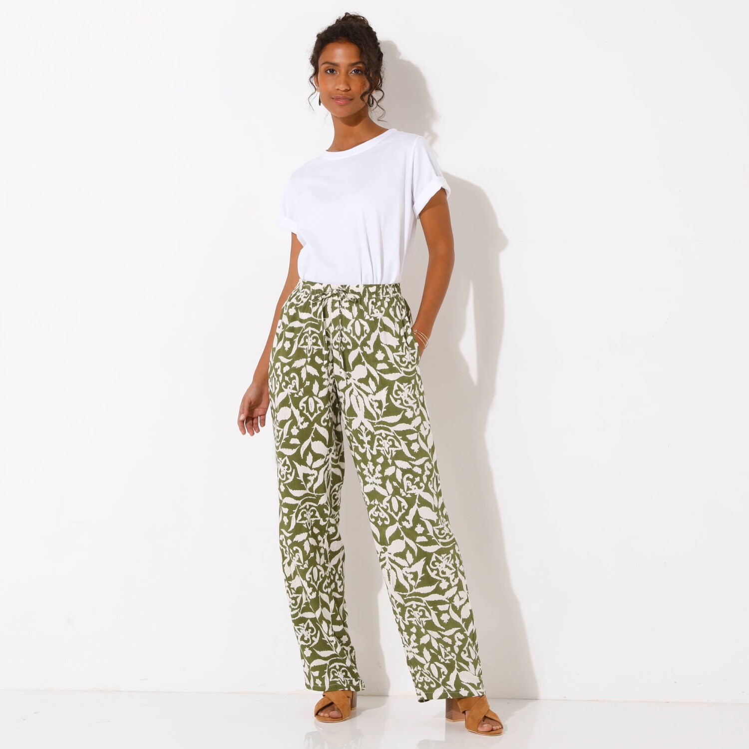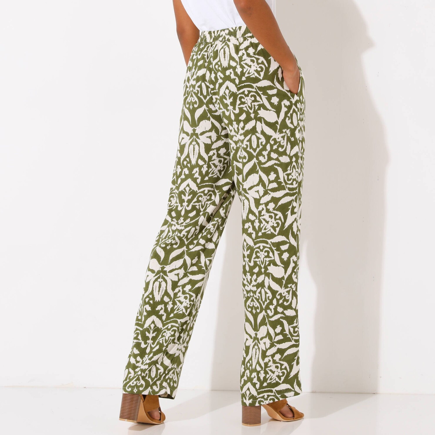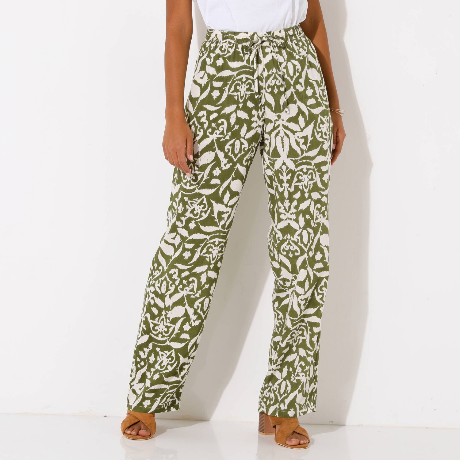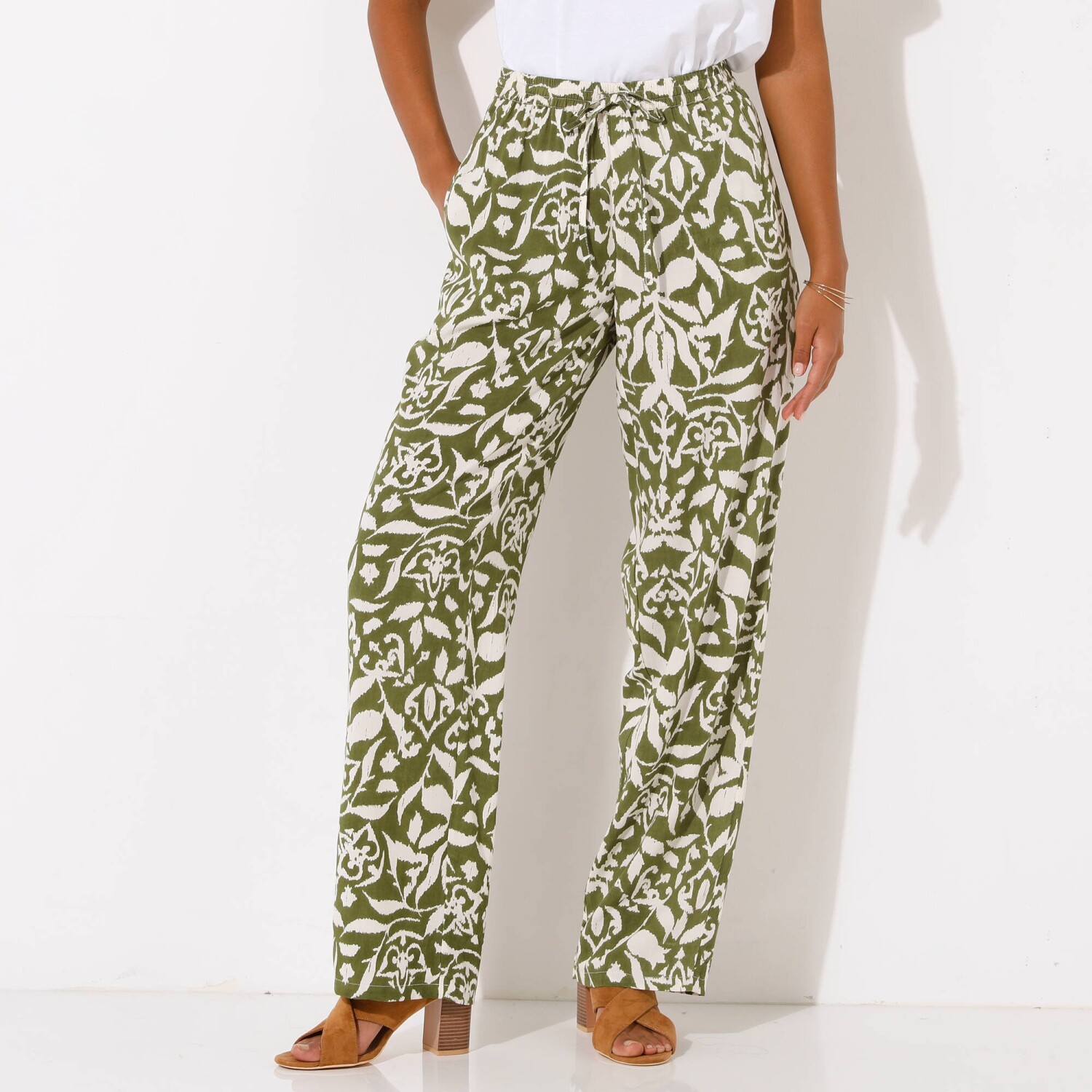 Módny tropický dizajn vo verzii XXL, tieto vzdušné nohavice sú 100 % štýlové! Bežná výška pásu. Rovný strih s ľahkou údržbou. Vpredu plochý, vzadu pružný pás. Vpredu 2 klinové vrecká. Vpredu 2 zámiky. Nohavice zakončené lemom. Vzdušný materiál. Možno prať v práčke.